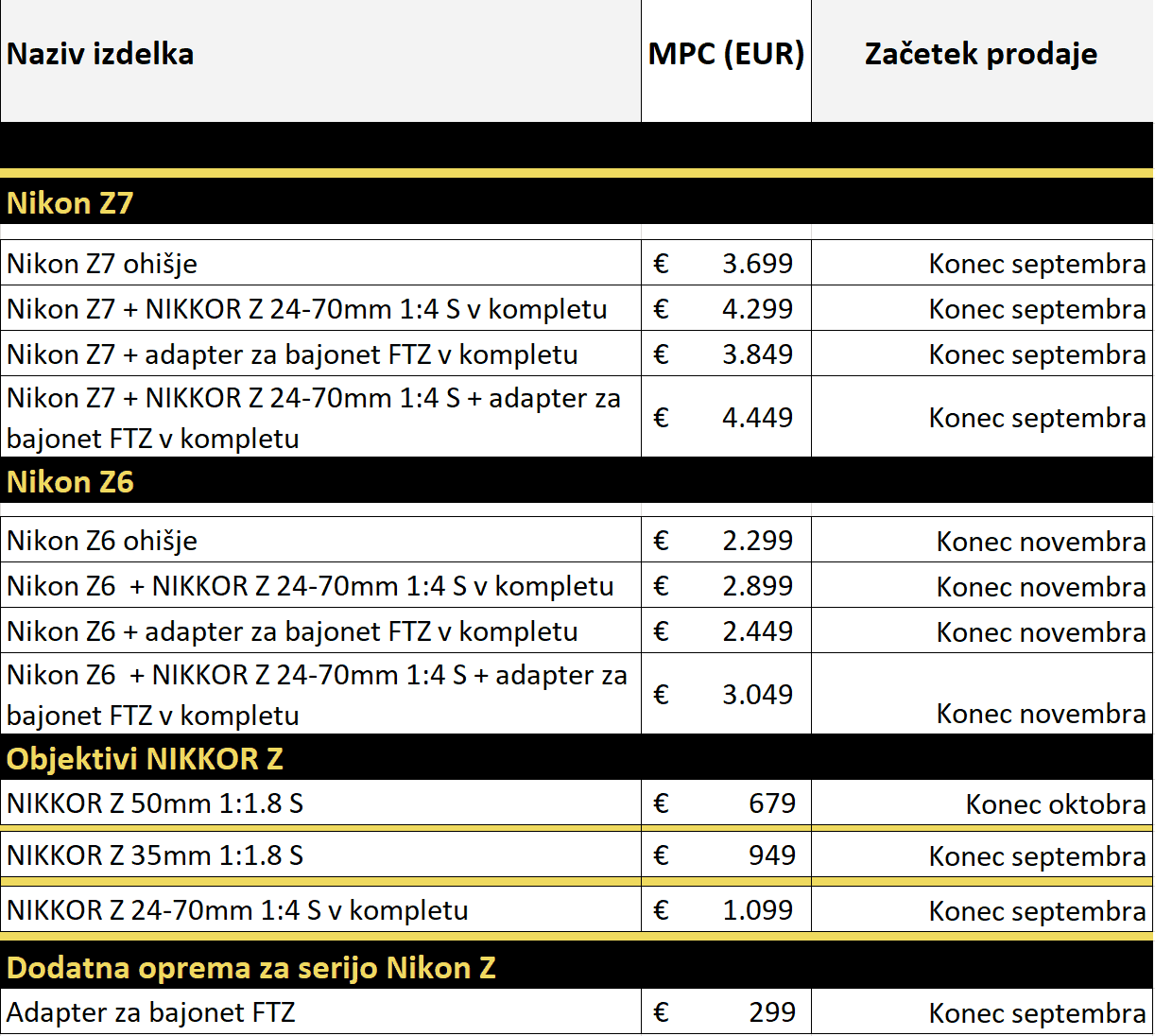 Nikon je na trg brezzrcalnih fotoaparatov polnega formata FX vstopil z dvema modeloma fotoaparatov Z6 in Z7, tremi novimi objektivi ter novim sistemom bajoneta Z z zelo velikim premerom. Novi bajonet omogoča več možnosti oblikovanja objektivov, vključno s predstavljenim najhitrejšim objektivom v zgodovini Nikona s svetlobno močjo f/0,95. Z novim adapterjem FTZ bodo z novim bajonetom združljivi tudi objektivi Nikkor z bajonetom F.